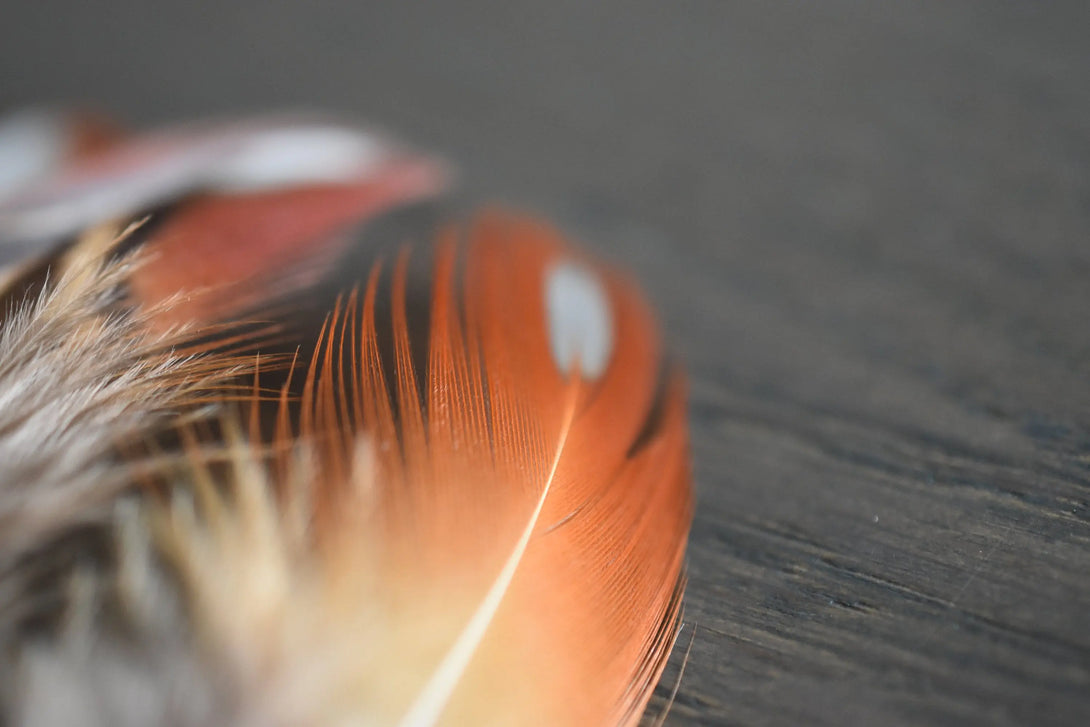 Plumes assez rares à trouver en France. Base de la tige en duvet gris et blanc sur une bonne moitié, puis couleur blanche sur la partie intérieure des barbes du haut, entourée d'un magnifique orange, typique de cette plume.